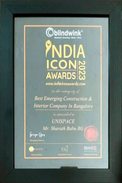 Unispace's recognition as the "Best Emerging Construction and Interior Company in Bangalore in 2023 by India Icon Awards" underscores the company's dedication to transforming spaces and setting industry benchmarks.